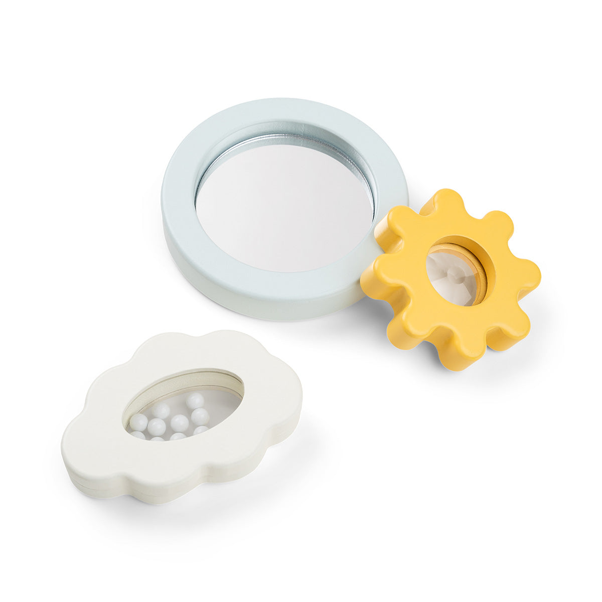 • Stimulierende Elemente wie ein Spiegel, eine Rassel und eine Kaleidoskoplinse